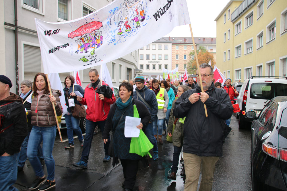 der geplanten MVG-EKD-Novellierung mit den Forderungen der ArbeitnermervertreterInnen auseinanderzusetzen. Unsere Aktion unter der Organisations- leitung von ver.di war ein voller Erfolg! Bereits vor Beginn des Eröffnungsgottesdienstes räumte die Präses der Synode der Evangelischen Kirche, Irmgard Schwaetzer, in einem Exklusiv- interview ein, dass die Arbeitnehmerinte- ressen ernst genommen werden würden und der Entwurf an einigen Stellen noch eine Verbesserung erfährt. So insbesondere bezüglich den im Entwurf vorliegenden Verschlechterungen bei der Mitbestimmung bezüglich Einigungsstellen würde die Kennzahlen nach unten korrigiert. Sie betonte abschließend anerkennend, dass es ein besonderes und wichtiges Zeichen in unserer Demokratie sei, wenn sich so viele Menschen am frühen Sonntagmorgen hier im strömenden Re- gen versammeln. Lautstark sind wir durch Würzburg von der St. Stephanskirche zum Tagungsort der Synode gezogen und haben demonstriert: