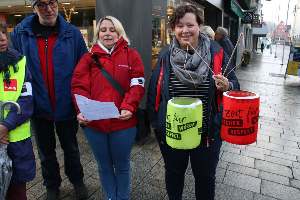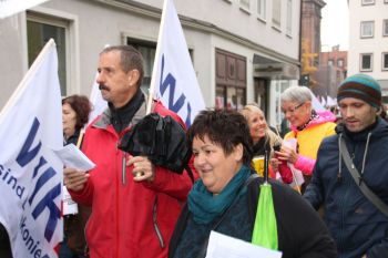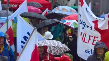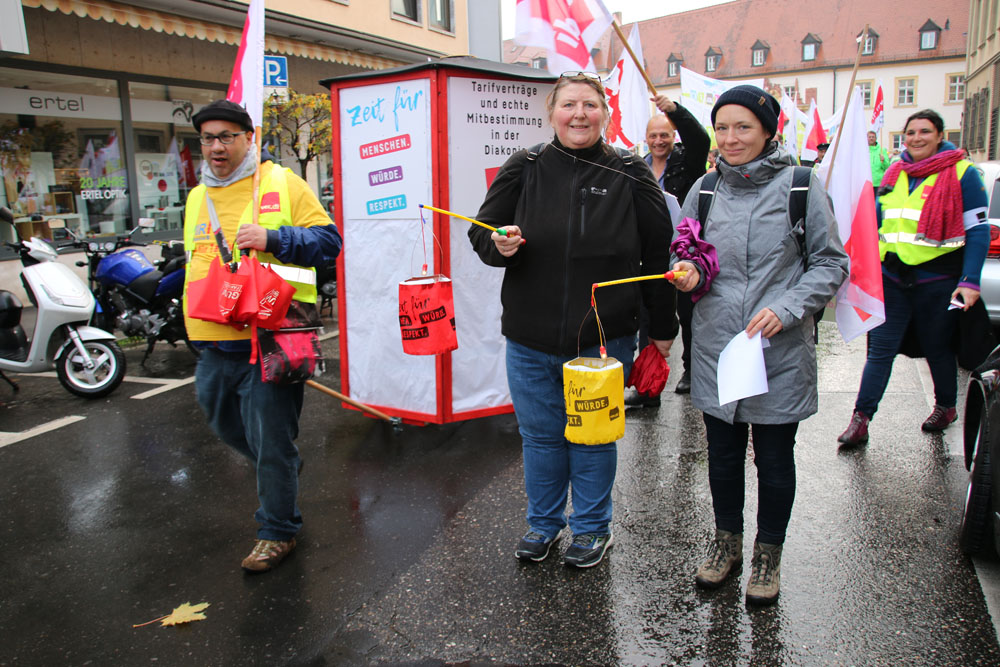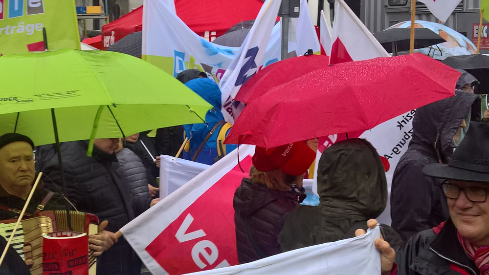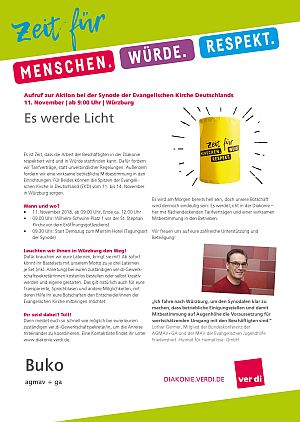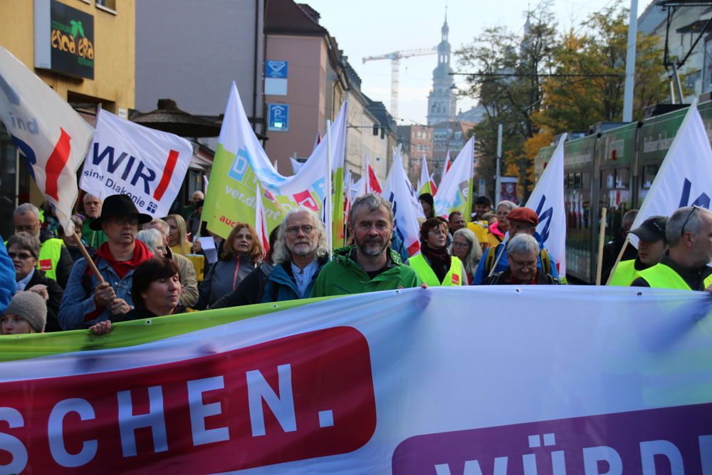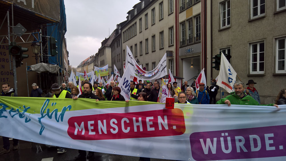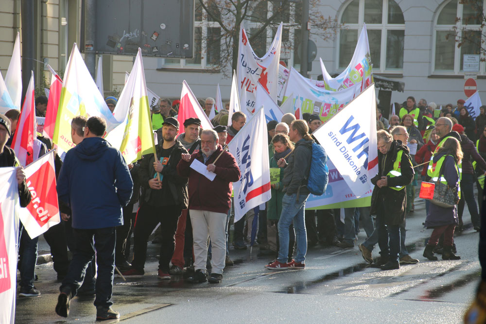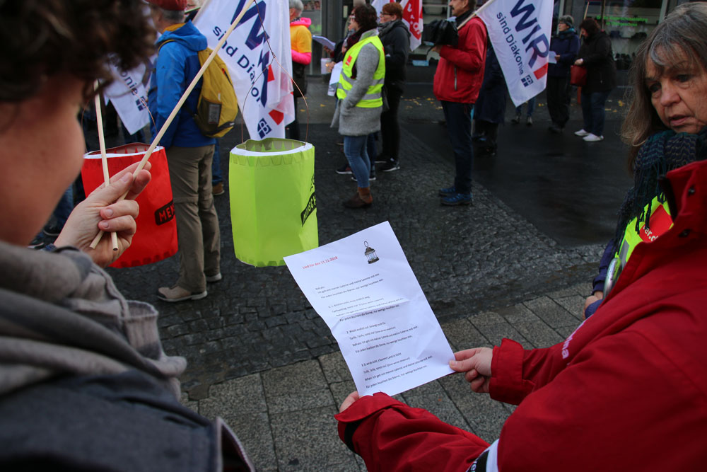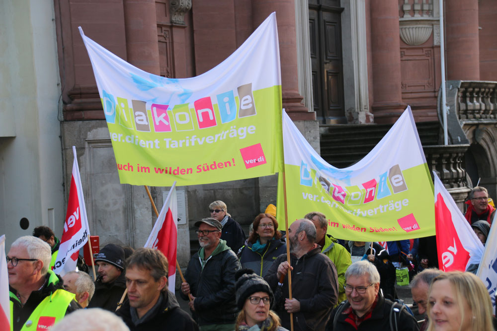 der geplanten MVG-EKD-Novellierung mit den Forderungen der ArbeitnermervertreterInnen auseinanderzusetzen. Unsere Aktion unter der Organisations- leitung von ver.di war ein voller Erfolg! Bereits vor Beginn des Eröffnungsgottesdienstes räumte die Präses der Synode der Evangelischen Kirche, Irmgard Schwaetzer, in einem Exklusiv- interview ein, dass die Arbeitnehmerinte- ressen ernst genommen werden würden und der Entwurf an einigen Stellen noch eine Verbesserung erfährt. So insbesondere bezüglich den im Entwurf vorliegenden Verschlechterungen bei der Mitbestimmung bezüglich Einigungsstellen würde die Kennzahlen nach unten korrigiert. Sie betonte abschließend anerkennend, dass es ein besonderes und wichtiges Zeichen in unserer Demokratie sei, wenn sich so viele Menschen am frühen Sonntagmorgen hier im strömenden Re- gen versammeln. Lautstark sind wir durch Würzburg von der St. Stephanskirche zum Tagungsort der Synode gezogen und haben demonstriert: